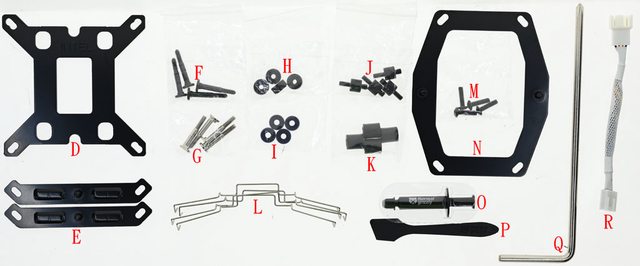 ▼安裝配件有Intel LGA1700/1200/115x/1366背板(D)、Intel托架(E)、