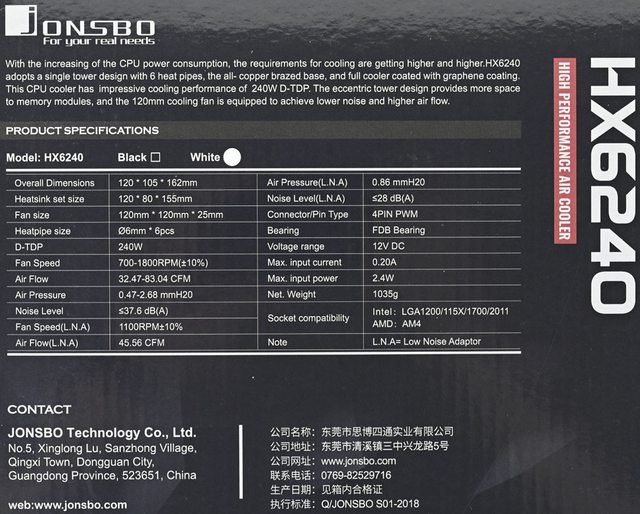 JONSBO喬思伯HX6240散熱器規格: