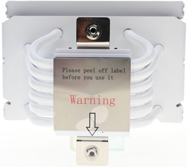 ▼散熱器底座的處理器接觸面有一張保護貼,上面用英文標示”警告,使用前請撕除保護