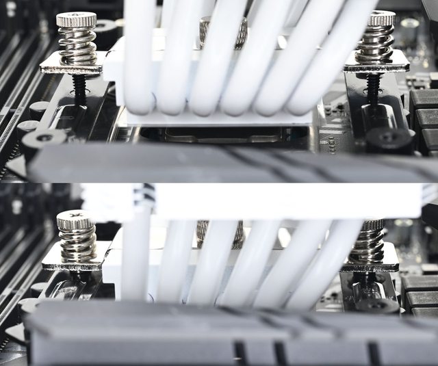 ▼正式安裝前先試裝,確認散熱器熱導管不會與主機板元件/散熱片發生干涉