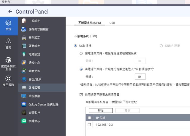 圖是我設10分鐘斷電會通知QNAP關機