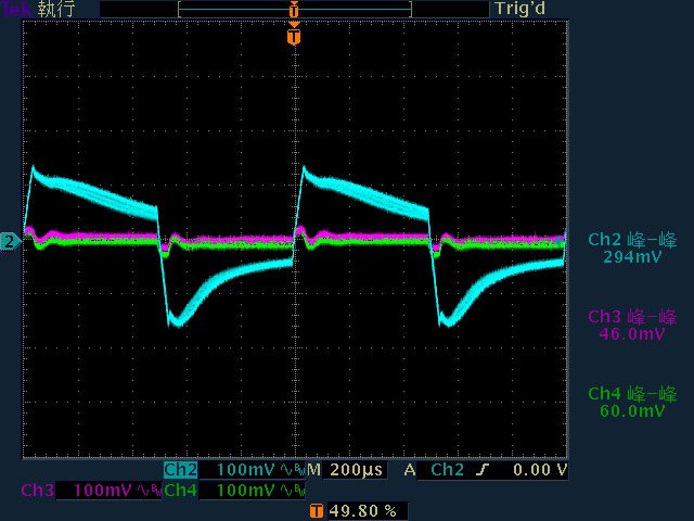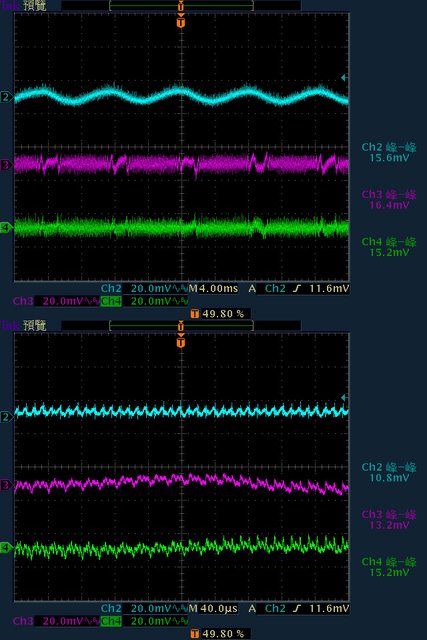 輸出下12V/5V/3.3V各路低頻漣波分別為15.6mV/16.4mV/15.2mV