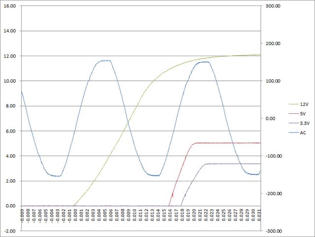 ○電源啟動至綜合全負載輸出狀態,12V上升時間26ms,5V上升時間4ms,3.3V上升時間