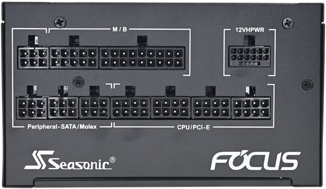 ▼模組化線組輸出插座有名稱標示,左下方有Seasonic商標,右下方有FOCUS字樣