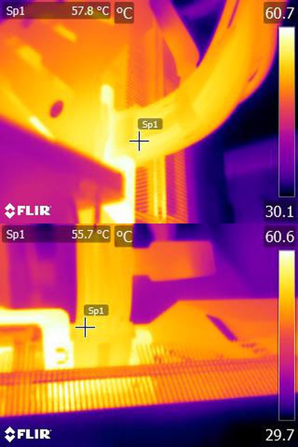 ▼執行FURMARK 30分鐘後顯示卡端插頭的紅外線熱影像圖(附註:安裝位置環境溫度會影