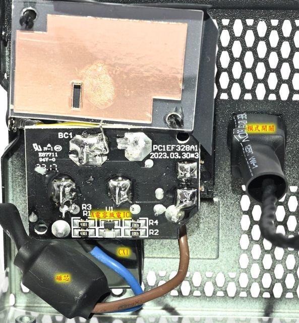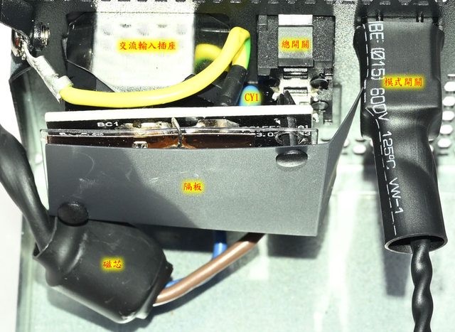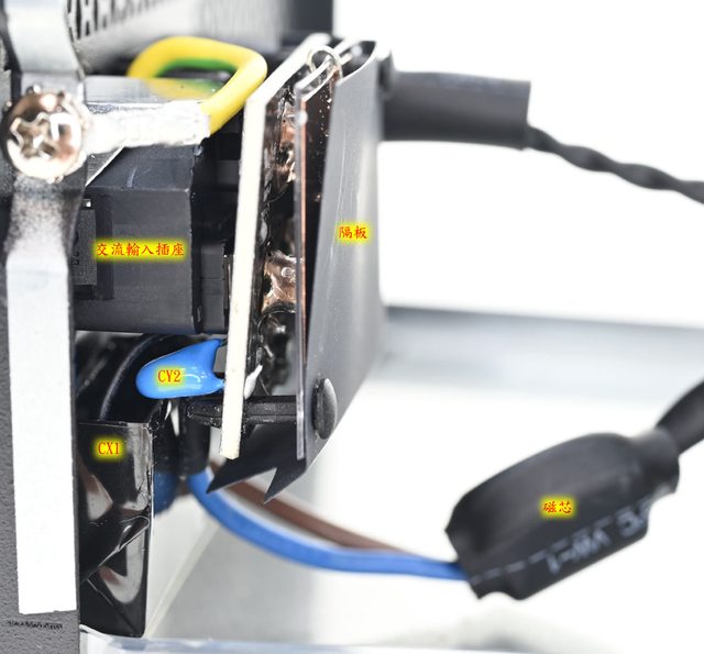 ○交流輸入插座及總開關後方小電路板背面覆蓋隔板。磁芯/交流電源線/模式開關本體/