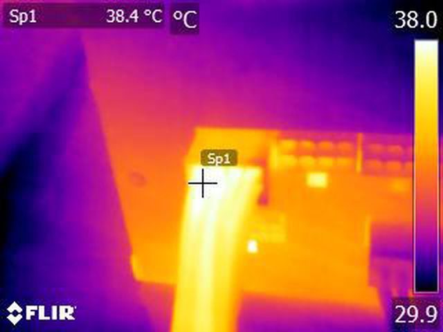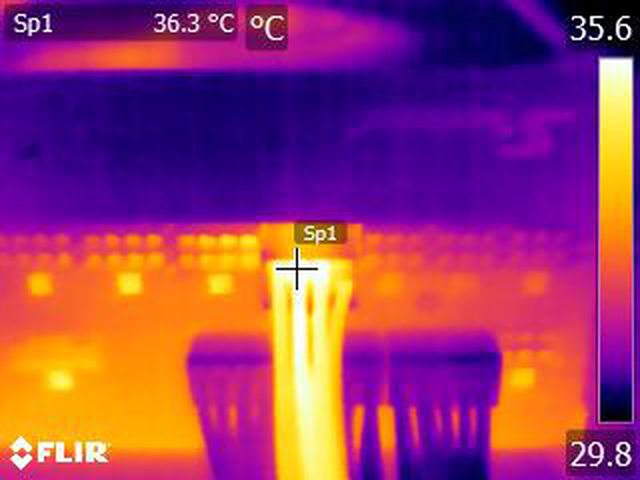 ▼執行FURMARK 30分鐘後電源端插頭的紅外線熱影像圖(附註:安裝位置環境溫度會影響