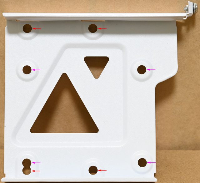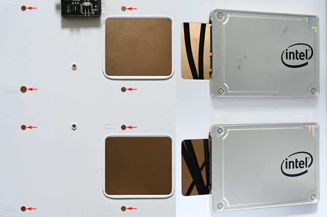 ▼底板正面前方有2個2.5吋SSD安裝位置(紅色箭頭為固定孔),可在底板正面前方安裝2個