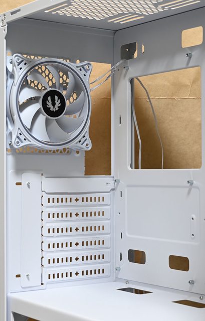 ▼機殼後方右上長條形固定孔可安裝1個120mm風扇,水冷排可裝到120mm,提供7個標準擴