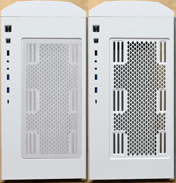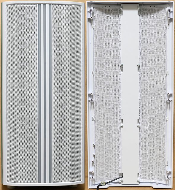 ▼前方中央3條乳白色ARGB LED燈條兩旁配置高密度金屬網孔板,背面有不可拆卸的過濾