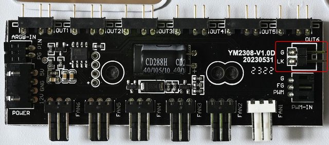 ▼燈光風扇控制板,提供6個3pin ARGB插針(OUT1至OUT6)及6個風扇3pin插針(FAN1至