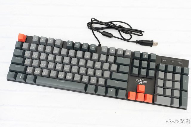鍵盤配置標準的美式108鍵配置,ESC以及方向鍵以紅色做為強調