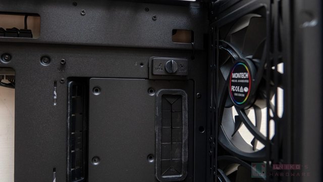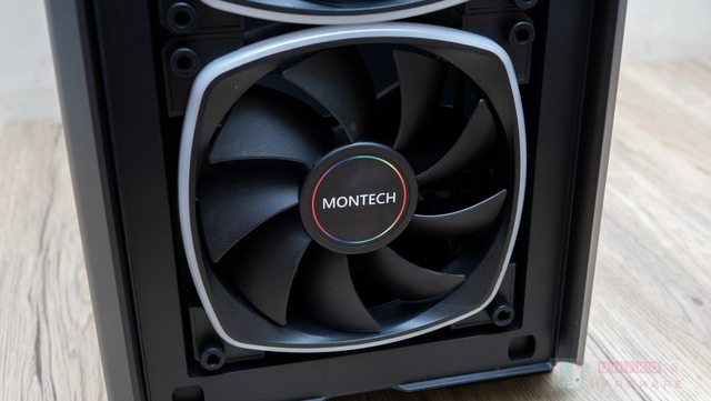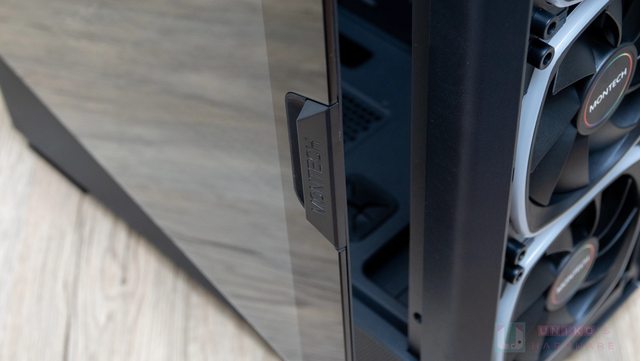 覆蓋主機板艙的是透明玻璃,以轉軸搭配磁吸方式固定,另外還做了一個有 Montech 字樣