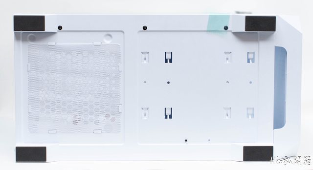 底部於電供位有作一個可拆卸式的防塵網,另外靠近前方也能看見有硬碟籠的安裝溝槽
