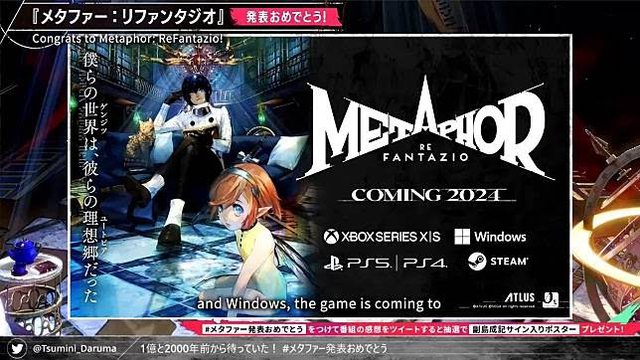 日本 Atlus 於之前「Xbox Games Showcase」節目中公開,預定自 2024 年起在 PC/Xbox Series X|S 等平台推出的完全新作幻想 RPG《暗喻幻想:ReFantazio》(Metaphor:ReFantazio/メタファー:リファンタジオ),宣布也將會推出 PS5/PS4/Steam 等版本全球同步推出。