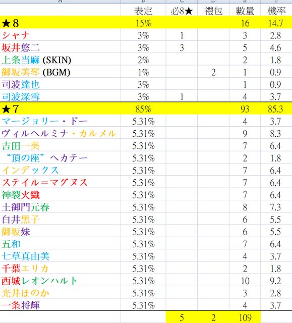 合計 109抽 + 5*必8 + 2*禮包