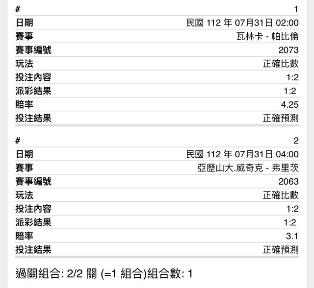 週一沒什麼比賽 午休速刷網球 隨便寫寫隨便看看 1.D.E加朗 2:0 2.25 or D.E加朗 -1.5 1.70 切雞假球狗最近狀態又很差,除了上一輪基本都是一輪遊,會怕假球狗搞事就不要玩這場 ,個人覺得會2:0帶走,穩定一點就是讓分~ 我個人買2:0 2.范阿斯切 2:0 2.35 or 范阿斯切 -1.5 1.85 這兩個上一站都有打小紫,看狀態這個法國人比較好,看好這個19歲小將直落2,穩定一 樣買讓分,我個人買2:0 2*1 5.3倍 GOGO -- ※ 發信站: 批踢踢實業坊(ptt-website.tw), 來自: 223.141.222.231 (臺灣) ※ 文章網址: https://ptt-website.tw/SportLottery/M.1690778694.A.806
