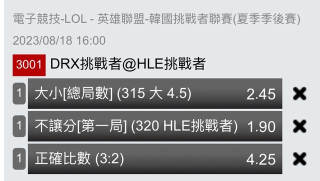 昨天雷了 因為推薦都是照順序 第一個倒就覺得對不住了 歡迎反下~ 16:00 [email protected] 例行賽DRX.C 二比零 NS.C 季後賽 被1:3 例行賽DRX.C 零比二 HLE.C 季後賽 會3:1? 然後竟然DRX.C上盤? 兩隊對戰幾乎都打好打滿 只能繼續相信師傅說的話 加上首局下盤在連 猜一個BABAA 推 4.5大 2.45、HLE.C 首局 1.9、3:2 4.25 https://i.imgur.com/Zg2Oz0G.jpg