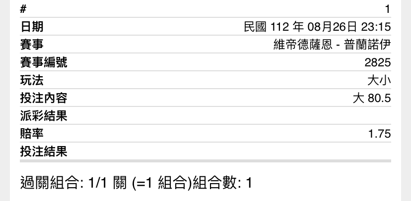 邊等女單對決邊寫 結果安小妹今天打很好= = 本來都打好草稿了只能改變方針 第一場男單 維帝德薩恩@普蘭諾伊 兩個搞大分組合 主推80.5大 看好三盤 雖然兩人上次對決2:0由泰國人取勝,不過依照狀態來說,王子維打的精彩拿下了維帝的 第一盤,前兩盤都是有來有往;不過反觀普天王8強是逆轉2:1拿下主場龍王,這樣來看為 什麼會開普天王下盤呢?真奇怪?難道是依照上一次對決嗎? 所以依照狀態我會樂透 普天王2:1 3.75 第二場男單 安東森@奈良岡功大 屁孩對決鹿的組合 主推安東森第一局 1.75 這場開平手盤,雖然奈良鹿上一場壓制石宇奇看似狀態不錯,不過常在看羽球應該知道石 宇奇這個人心態爆炸就是超級搞…所以輸鹿我也覺得還好 兩人的對戰歷史依舊是看好安東森,而且主場最後希望只剩這屁孩了,有著上次印尼公開 賽被2:1逆轉的經驗,所以才主推首局安東森~ 樂透正比 猜測安東森2:0 結論是 主推 80.5大串安東森第一局 樂透 普天王2:1串安東森2:0 -- ※ 發信站: 批踢踢實業坊(ptt-website.tw), 來自: 111.82.244.68 (臺灣) ※ 文章網址: https://ptt-website.tw/SportLottery/M.1693062015.A.1E6