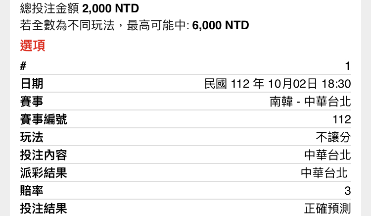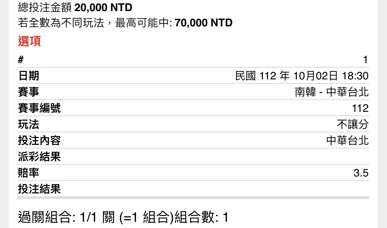 推 aaaccc112: 謝謝帥呆的中華隊 小資贏最多的一次 61.230.53.176 10/02 21:56