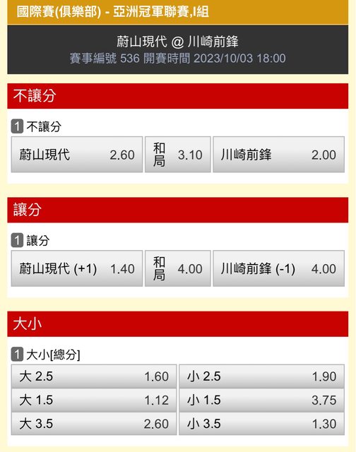副推:大2.5(1.60)、蔚山現代不讓分(2.60)