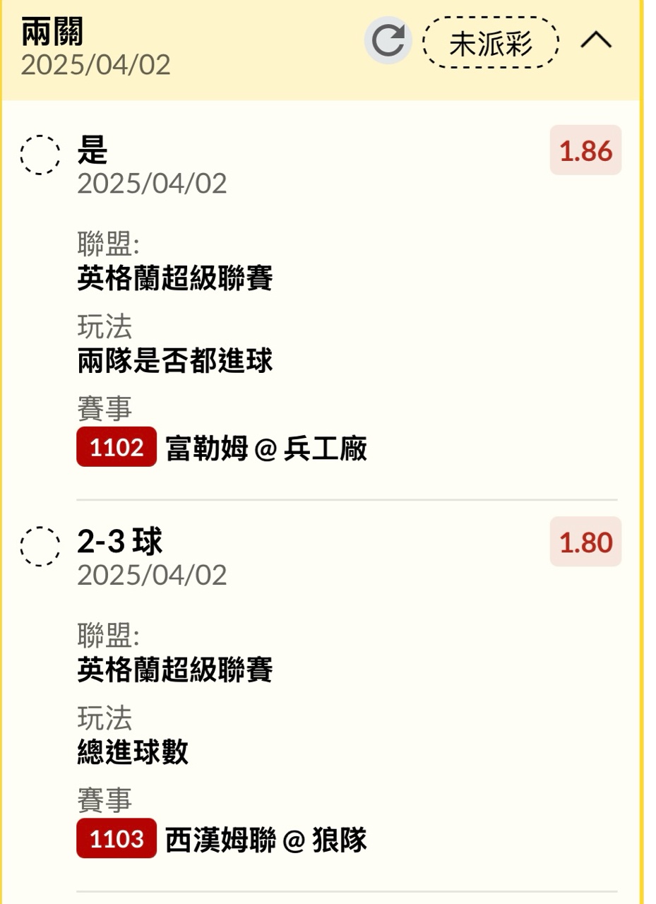 西漢姆聯 @ 狼隊 21*狼 H:T 0:1 F:T 0:1 (孬剛精選場 兩個近距離都能射歪...) -----(以下無場中 無單場 要串2) 曼聯 @ 諾丁漢森林 5*我大森林 H:T 0:1 F:T 0:1 ----- 富勒姆 @ 兵工廠 37*兵 H:T 0:1 73*兵 90+4 富 F:T 1:2 -- ※ 發信站: 批踢踢實業坊(ptt-website.tw), 來自: 122.100.84.220 (臺灣) ※ 文章網址: https://ptt-website.tw/SportLottery/M.1743532709.A.424