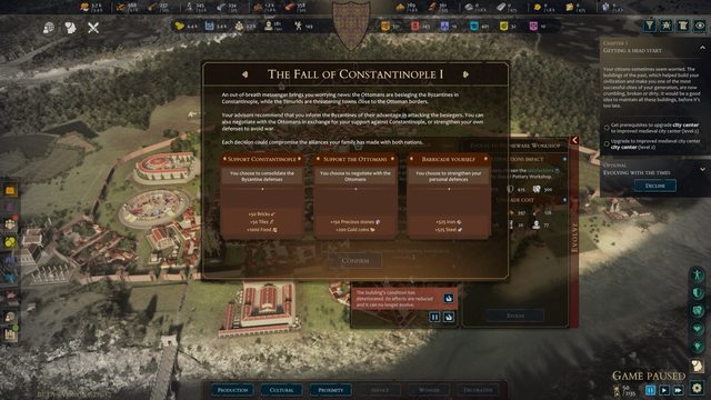 隨著人口與資源的累積,生產力建築與市鎮中心都可以升級,我們每個階段的最終目標是
