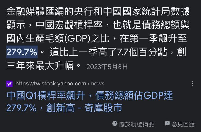 3個月借了GDP的 7.7%大概是40兆台幣 就是印鈔還債呀 問題是如果你每年本利佔比太高 稅收遠不夠 那意味只能借更多錢來還 這樣遲早爆掉 中國經濟從13年左右出口停滯以後 就一直在印鈔基建 印鈔還債 現在是到頭了 中國式舉債問題的根源 1. 舉債效果沒想像中好,第一年借了往後每年都要越借越多才能維持增長 為什麼中國債務成長這麼快呢? 我們假設今天國民收入80繳稅20給政府花 總GDP 100 但是為了彰顯社會主義優越性 於是政府多負債10 GDP變110 很爽 GDP瞬間多了10% 贏麻了 但你有想過 那明年呢? 明年人民賺了85 繳稅21給政府花 GDP 106 但這樣母湯呀 這樣不是比去年110還衰退? 於是黨說那今年GDP目標9%好了 於是借了14元 GDP變成120 大後年賺88元繳稅22元給政府 黨說今天經濟比較差 那來訂個目標7%好辣 於是借了18元 GDP變成128 這裡可以發現 一開始借10元增長10元 拉動10%GDP 但到第三年總共借了42元 GDP才多增長18元 多增長7% 這只是列舉3年而已 過程還沒算利息 中國以前利息高 如果15年呢? 隨便估 加利息最終可能借了300 GDP才多增長30 原理是第一年那個10元本來就不是你賺的 不是你第一年借10元欠10元就算了 而是往後你每年都要借錢 去補那個從來沒賺到過的錢 不然GDP就坍塌了 2. 為什麼中國大舉債卻還通縮? 因為中國舉債都是去投不賺錢的基建 所以你投的東西不能自行償債 也不能讓你稅收增加 但利息卻越滾越多 每年借一堆錢是給國企和地方還本金利息來著 3. 那為什麼舉債要給基建不像美國給居民? 首先 中國 gdp有考核指標 我給屁民屁民給我存起來那我GDP怎麼辦? GDP不達標 明年省長就變縣長了 其次 中國本質是紅色家族牧場 用人礦換美元 我發錢給你 促進民間消費 拉抬居民收入與通膨 那我採礦成本不是變高了嗎? 所以你可以看到 上海人均2.6萬美金 房價租金比台灣還高 最低薪資大概1萬台幣 就擺明我在意人礦開採成本而不是消費 4. 舉債擴張信用眼下問題是人民幣面臨劇貶 你發這麼多錢要有地方放 以前是放房市 可以把中國的房市當成比特幣錢包 一來 蓋房子要一堆GDP 二來 錢都拿去買比特幣 沒有流到市面去稀釋貨幣價值 贏 贏麻了 但問題是以前連漲40年 現在開始跌了 那這時比特幣不但吸引不到錢流入 還一堆流出 別的市場還有股市可以跑 但A股呵呵 所以錢這時候只有兩個地方可以去 存款和境外資產 所以可以看到中國利率不斷下調 匯率也不斷貶值 只能說 出來跑 遲早要還的 5. 中國政府花費不是人民真實需求,會造成資源錯配與生產力浪費 中國蓋一堆有的沒的 問題是社會根本就不需要這麼多 但是你的信貸 人力資源已經大量投入 形成一個龐大產業鏈 哪天發現根本不需要這麼多 錢浪費不說 人力要重新學習 分配 才能適應新的產業需求 這種結構調整會抑制經濟增長 而且當初這些資源 本來可以用來生產更符合人民需求的產品或服務 以此利於產業升級 也因資源錯配而錯失機會成本 這也是凱因斯過度 被詬病的最大問題 這也是中國很難消費升級拉動產業升級的原因 中國需要一直發展基建 很大部分是圍繞基建的國企已經投資大量資源 就算中國哪天民主化了 這些產能要轉型也很困難 6. 中國式舉債很不民主 剛是生產端,以消費端出發,中國式舉債才能體現真實的問題 一般台灣美國日本大部分有舉債是給人民發福利 中國是幫你決定怎麼花 比如獨山縣1600億可以給貴州所有小孩免費上學 卻被用來蓋蚊子館 這種事中國太多了 那至於為什麼要蓋 好一點就是為了GDP 差一點就是容易上下其手 所以中國人很可悲 好像存在的意義是為了追求GDP 好炫耀中國已經偉大復興 而不是為了享受生活 7. 結語 一句話總結就是 你好奇中國為什麼不大舉債 事實上10年前早就開始 現在只是走到盡頭有點玩不下去 中國過去國企和地方債借一堆 利率隨便都5%以上 但這些投資投報率頂多2% 也就是光要補國企和地方債黑洞 就要借大把的錢了 其次要知道 今天要多1元GDP 未來要多借10元債務 才能把這個GDP撐住 所以可以看到中國政府每年還是盡量會訂立個舉債上限 因為你今年借錢可以把GDP用的很漂亮 可之後每年都要越借越多去補 那加上利息 最後你舉債還過去的本利都不夠 接著 你如果一直印 存款利率很快就變0了 樓市不行股市不行 中國就沒地方放錢了 那人民幣要跌到多少? 最後就是 消費上 中國式舉債就很不民主 本質是人民996的血汗錢給政府幫你消費大便 生產端上 這樣不民主的花錢 導致資源分配到沒意義的經濟活動上 而不是把資源投放在真實需求上進行產業升級 整個中國政府可以把他看成一個大國企 中國國企有的舉債弊病 中國政府都有 中國過去大舉債導致資源錯配產業無法升級 經濟結構惡劣 調整困難 負債需各種變相加稅 遏止消費 導致中國經濟超越美國的機率極低 最簡單的解釋 中國經濟結構長期扭曲 消費佔比才37% 而隨經濟發展 基建政府開支佔GDP比重必然越低 因此中國透過政府支出的GDP是不可持續的 而2016-2021 中國平均消費扣除物價是3.5% 而這段期間房價和老齡化還沒有開始影響 未來理論會更低 如果中國要像所有發達經濟體一樣 消費佔GDP比勢必要抬升 意味中國理論上的GDP不可能超過3.5% 當然維尼愛面子 經濟結構轉型必然伴隨陣痛 原有產能會浪費 短期失業會飆高 經濟會下行 那還怎麼贏麻? 因此不排除中國繼續基建10