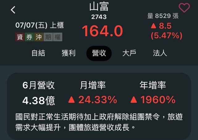 本資料由 (上櫃公司) 山富 公司提供 民國112年06月 單位:新台幣仟元 項目 營業收入淨額 本月 438,317 去年同期 21,273 增減金額 417,044 增減百分比 1,960.44 本年累計 1,875,774 去年累計 130,134 增減金額 1,745,640 增減百分比 1,341.42 備註 / 營收變化原因說明 國民對正常生活期待加上政府解除組團禁令,旅遊需求大幅提升,團體旅遊營收成長。 http://i.imgur.com/okBWzO6.jpg