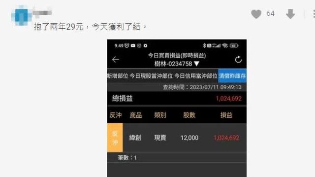 有網友近來曬出損益圖,2年前以29元買進緯創,終於在近期賣出12張,爽賺102萬元,讓 投資人驚呼好羨慕,「能忍到現在,不是忘記就是強者!」而他則分享抱股心法,表示當 初只是想存股,圖緯創每年穩定配息,沒想到變妖股,「反正也才少少12張,早點入袋為 安,賣掉才是真的賺,不然都是紙上富貴」。 https://i.imgur.com/JOLZX9I.jpg