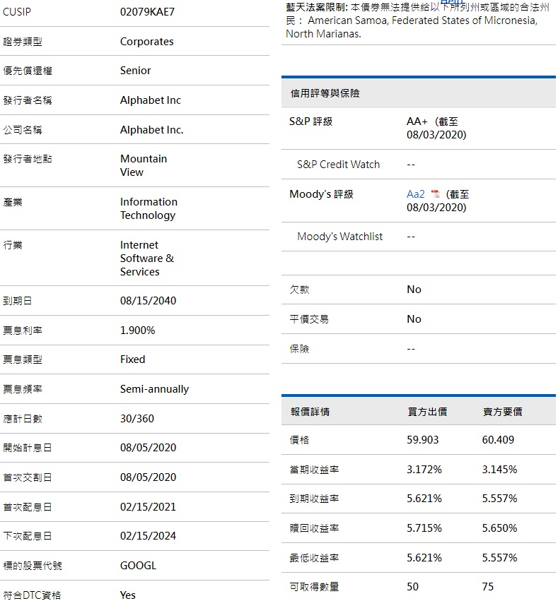 推 icelaw : 查了一下 目前在嘉信上買GOOGLE的20年長債 評價AA+ 10/28 01:50
