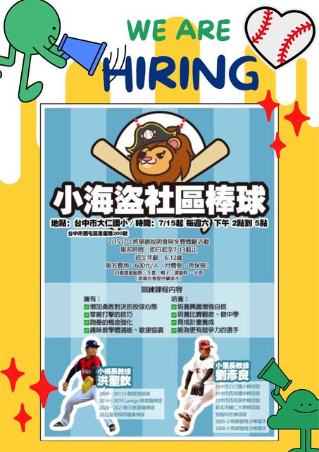 這週六有說明會,歡迎6-12歲喜愛棒球的小朋友一起來喔!