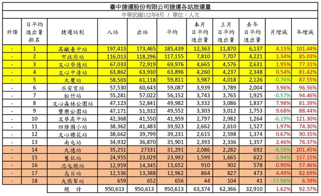 標題: [情報] 台中捷運112年6月各站旅運量