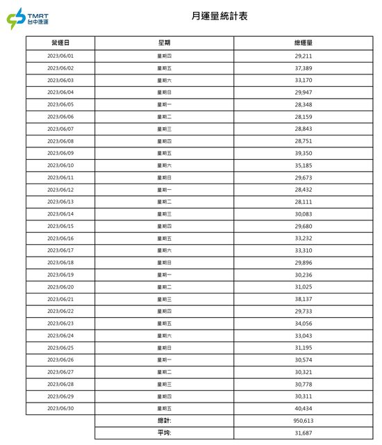 標題Fw: [情報] 台中捷運112年6月各站旅運量
