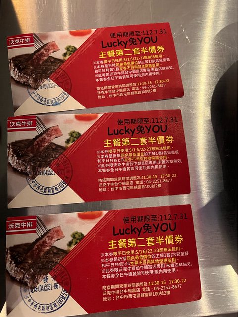 物品名稱:沃克牛排主餐第二套半價券3張/