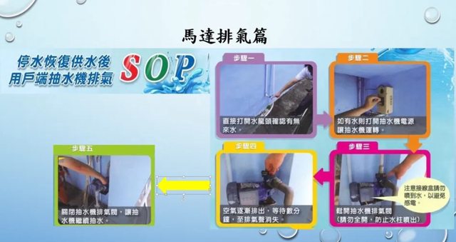 停水期間市民應關閉抽水機電源,避免馬達空轉而損壞或釀火災,復水後請將抽水機「排氣