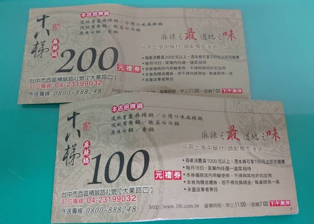 物品名稱:十八梯麻辣鍋折扣券兩張 陶板屋和風甜點分享券兩張