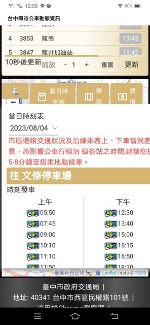 打個比方,如果有人問:哪牌的果汁最純、最健康? 我會回答:能夠的話,建議直接吃水果。 所以說,我會直接建議你用"台中市政府交通局"的網頁版, 我手邊有3款"台中市政府交通局"的網頁版, 想要詳細第一手訊息,最建議第一款,會直接顯示當日最新通阻訊息"今日取消發車資訊"。 ;想陽春型沒附地圖,建議第三款。 1.