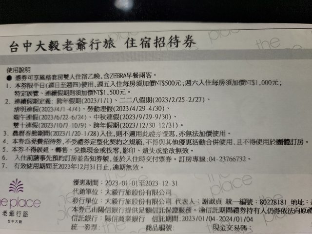 標題[交易] 台中老爺行旅雙人住宿券