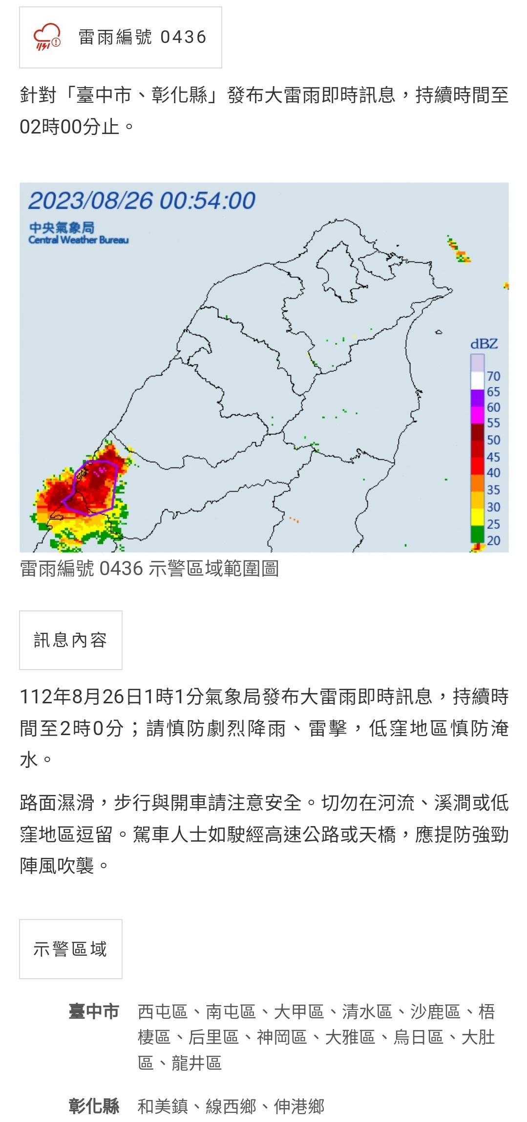 推 fspmlp : 目前也只有西屯區有達到大雨特報標準,其他沒有, 08/26 00:41
