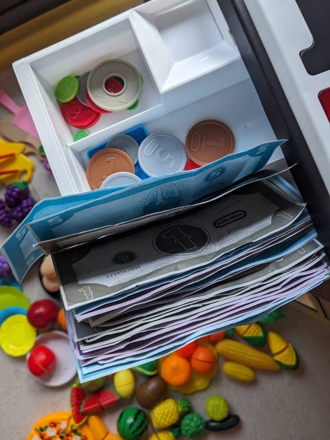 新舊狀況:一手/蔬果新舊程度不一/收銀機紙鈔流通率有點高XD皺皺的/還有增加一些貨