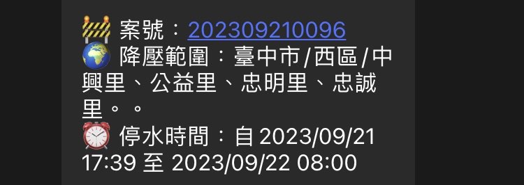 推 wellymac : 可以查台中水停水公告,有好幾個里延長停水到早上09/21 06:25