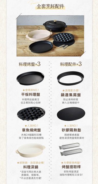 商品介紹:風靡全世界的日本時尚餐廚家居品牌Bruno,在日本銷售超過250萬台的「BRUNO多功能電烤盤」,擁有5段火力,最高溫度250度,時尚外型兼具多種功能,煎烤炒煮都難不倒,還可以做章魚燒!
