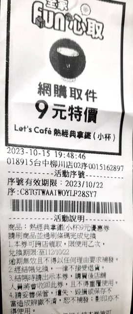 物品名稱:全家 熱經典拿鐵(小) 9元券