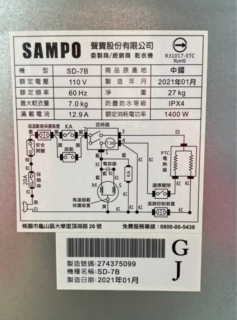 標題[商業] 中古聲寶7公斤乾衣機