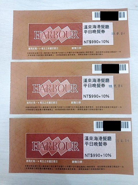物品:漢來海港餐廳 平日晚餐券 3張