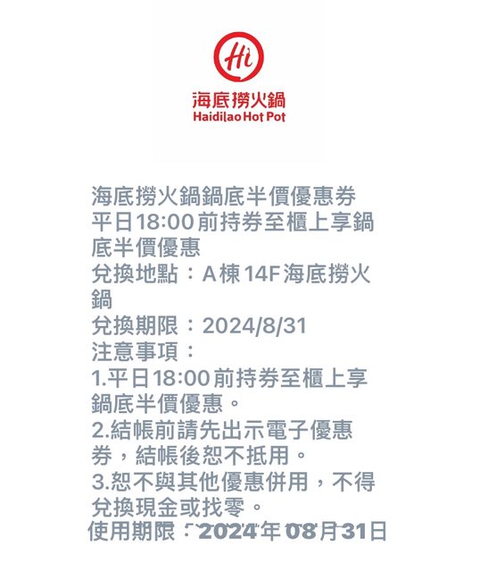 標題[贈送] 中友百貨海底撈火鍋湯底半價優惠卷