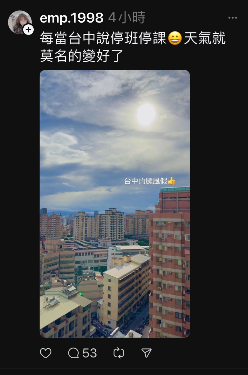 → tue678: 有顯著災情 淹水 風災 不然正常上班上課 42.79.228.9 10/03 12:43