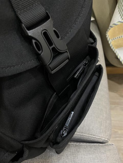 背後有獨立直暗袋很大 且有防盜扣環 此袋不會通到主袋 另一邊的直拉鍊則可直通主袋,也有防盜扣環,功能性超強