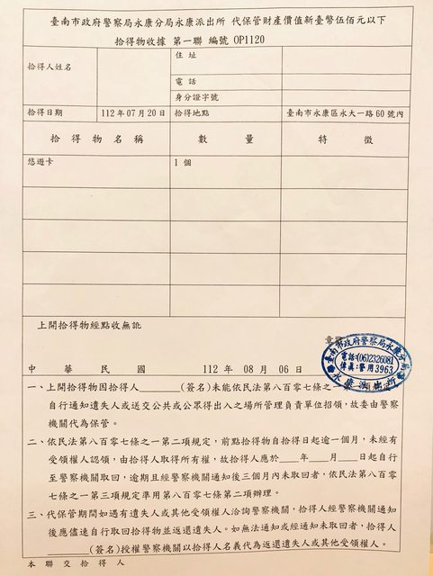 標題[失蹤] 統一雙永7-11門市拾獲悠遊卡